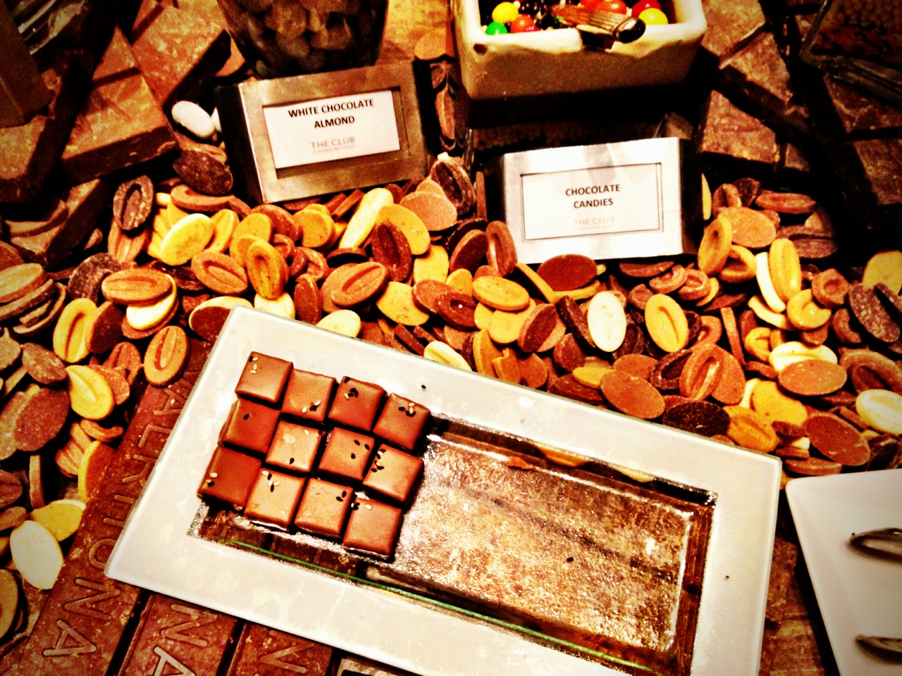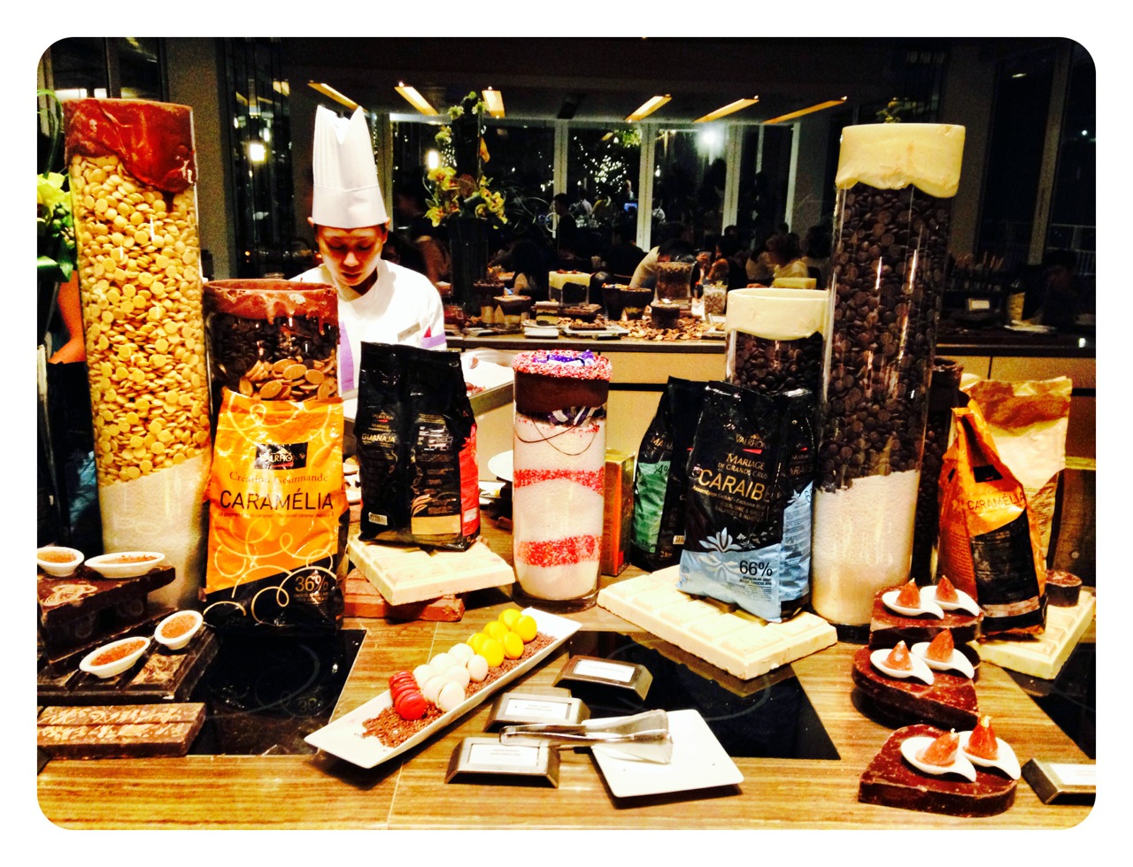 The Cheese and Chocolate Bar Buffet…it’s all very magical. You arrive at Tower 1 at the Marina Bay Sands, check in at the Rise restaurant, receive a slip of paper with your reservation, and are directed to the elevator to ascend to level 57. The lift takes you so high and so fast that your ears pop as you adjust to the change in altitude. As you step off of the elevator you are greeted with the most spectacular view of Singapore. When you finally catch your breath, a little man confirms your reservation and lets you know you are in for a very special treat: hot chocolate, mouthwatering truffles, dark chocolate mousse, white chocolate cheesecake, melt in your mouth earl gray macaroons and piping hot mini donuts. They even have a taste of Canada with their Nanaimo bars. You have your choice of smelly cheeses, soft cheeses, hard cheeses, mild and strong. Just writing about it all of this makes my blood-sugar level rise. Okay, okay… maybe I’m exaggerating just a bit.