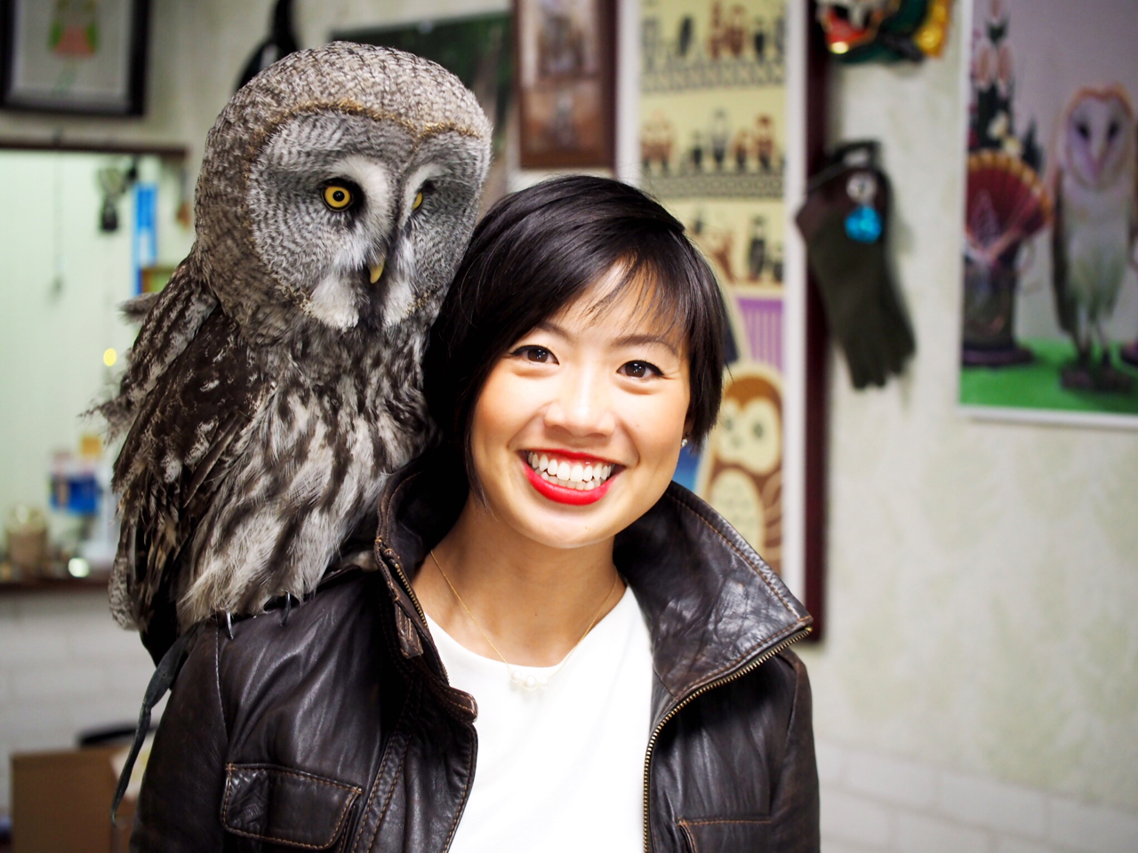 Well, was I ever surprised when the owner of the cafe (who speaks English, which is a plus!!) and owl keeper suggested that he could place an owl on my shoulder so that I could of course drink coffee out of my wood carved owl cup so that Thomas could take a picture. How could I resist this opportunity!? Well I couldn’t, and after rationalizing that an owl sitting on my shoulder does not qualify as petting, the result was an epic photoshoot. I loved every single minute of it!